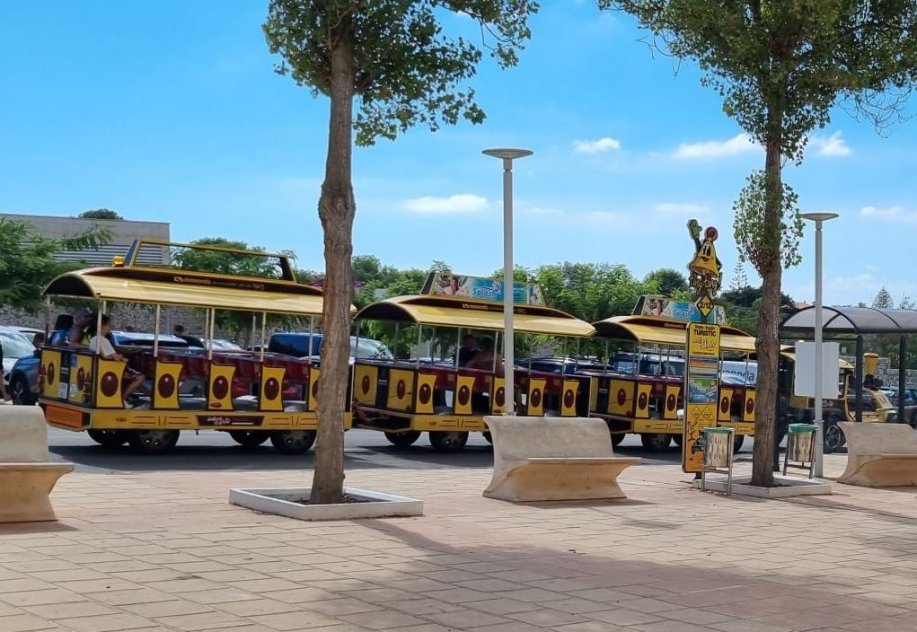 Fun train ( Tren Turistico ) travels in a loop along the coast from Punta Prima beach (...more) , Binibequer beach to Binibeca village (30 mins ) (...more) and back again ( ~45 mins.)