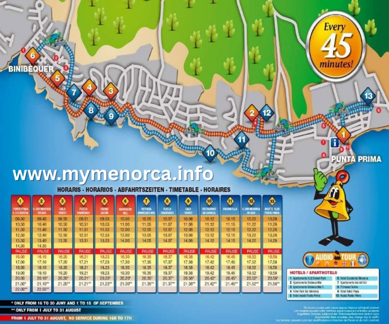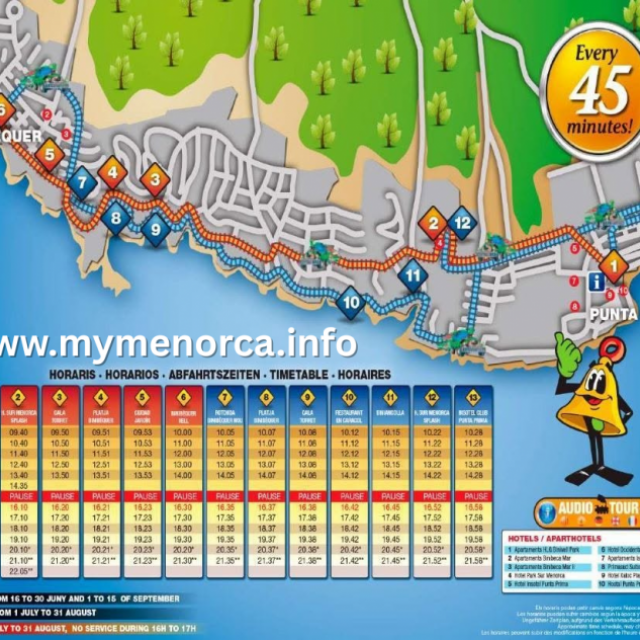 ~45 minute round trip. But it’s worth using the single and getting off eg @ binibeca beach (...more) / Punta Prima beach (...more) and getting a later train back. Stops at main hotels and has easily identifiable stops ( see photo )