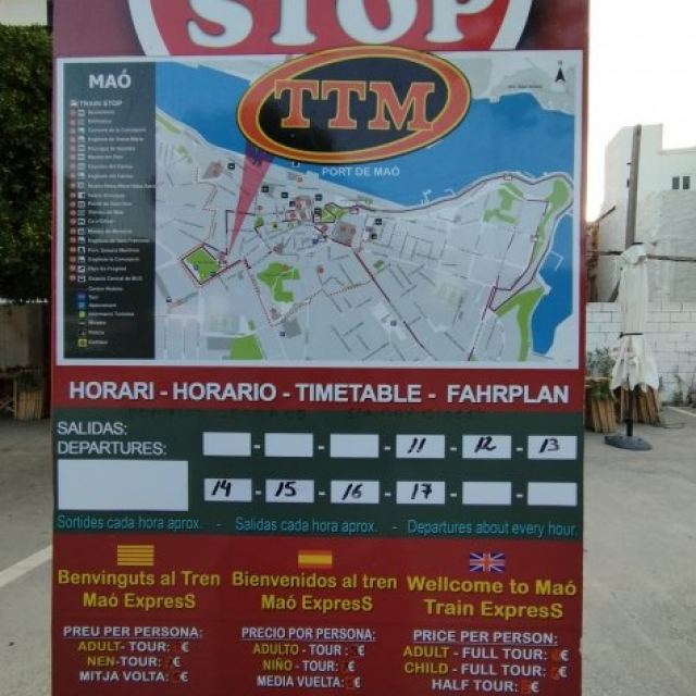 A good way to get a quick overview of Mahon without walking and fun for children. Departs from main square ( Placa del Esplanada (...more) ) for a 50 min trip around Mahon's principle sights. The ticket will allow you to get off and back on at set points ( Costa de ses Voltes (...more) Harbour steps, Port Mahon Hotel ) if you want to explore an area you fancy.
